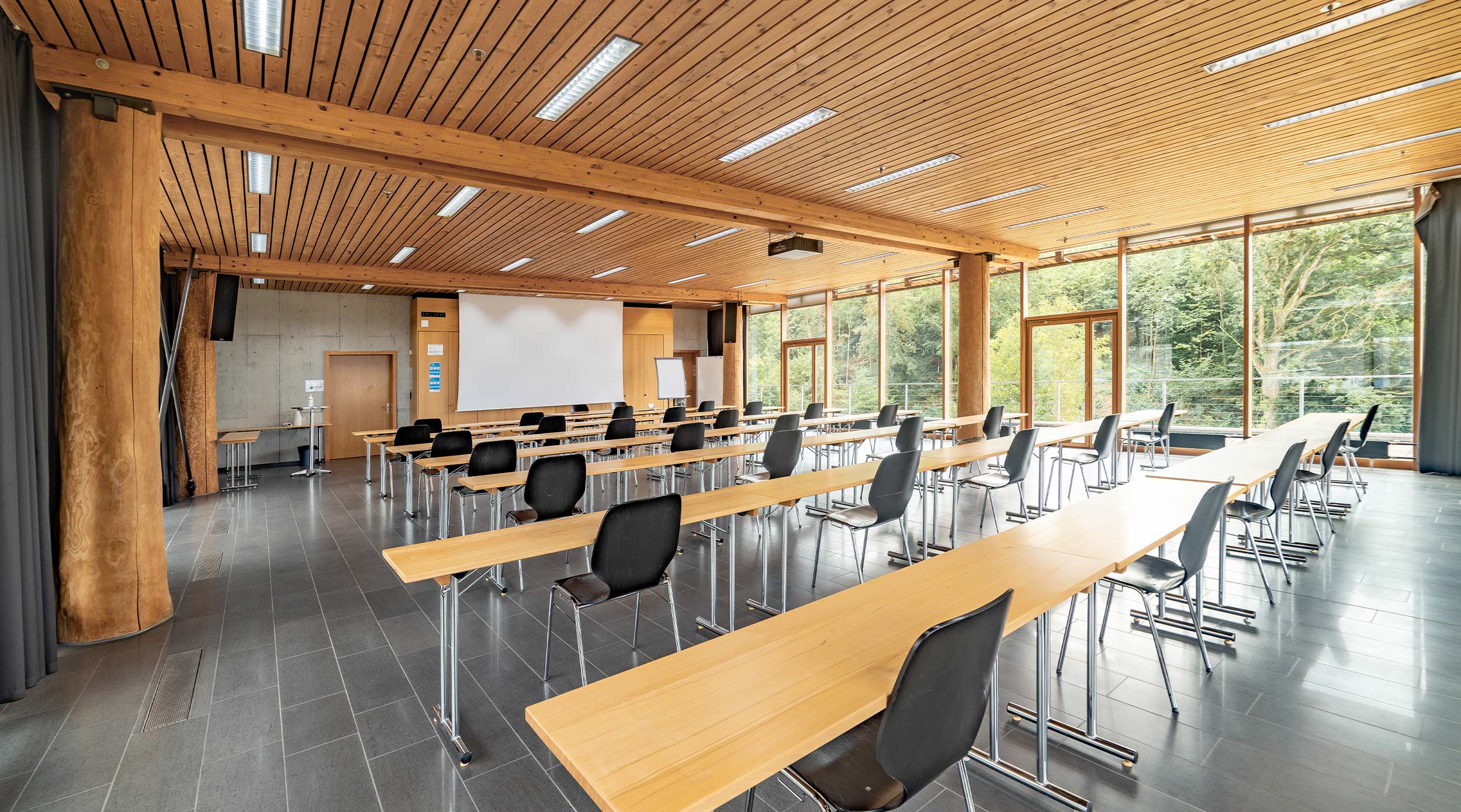 Nous disposons d’un large choix de salles. Des espaces lumineux, une infrastructure moderne et une architecture chaleureuse ou le bois règne en maître – un cadre idéal pour des événements réussis.