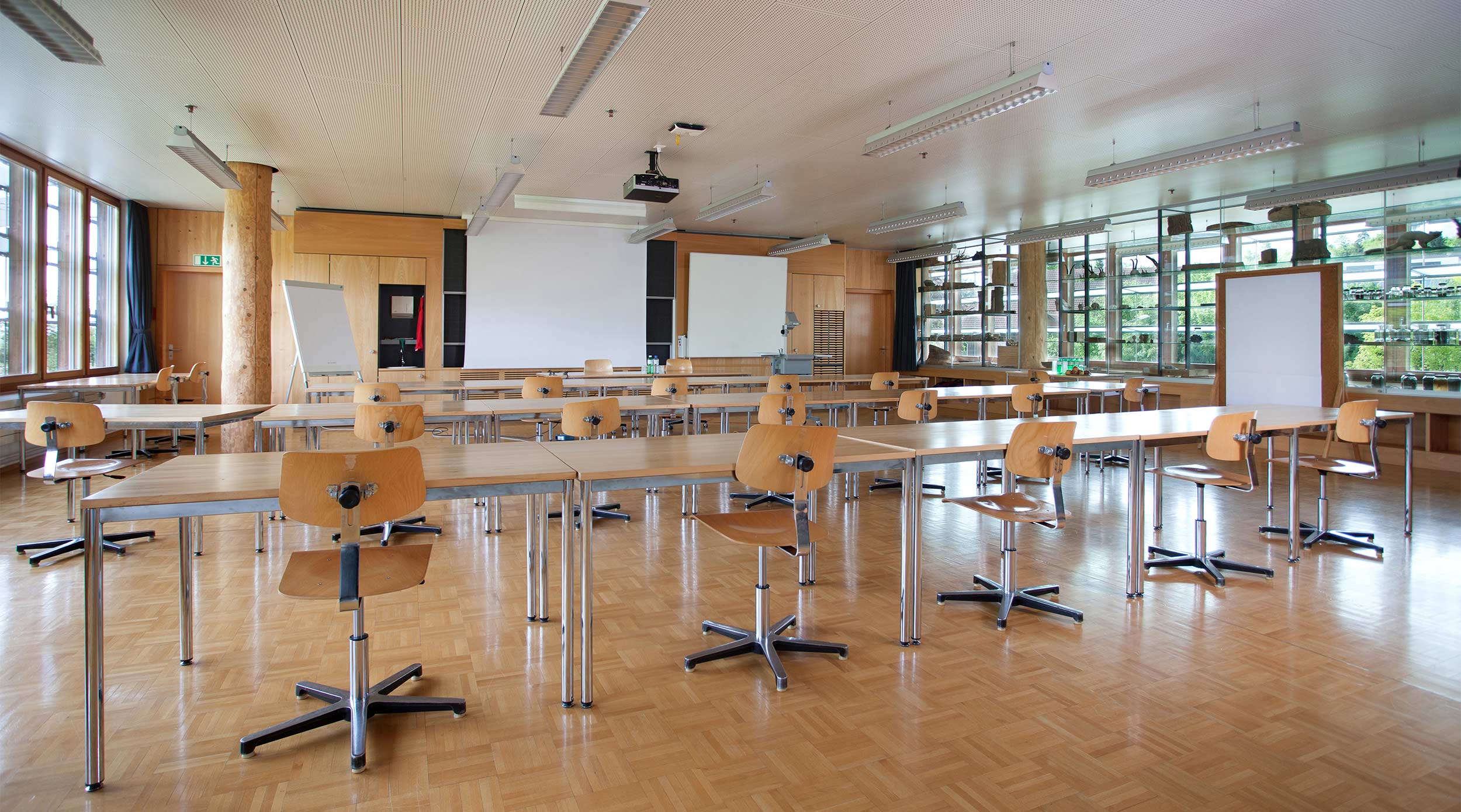 Les salles de séminaire sont connectées au WLAN (gratuit). L’aula et les salles de classe sont équipées de beamers modernes compatibles avec les types de raccordements les plus courants (HDMI, DisplayPort, USB-C, VGA)
